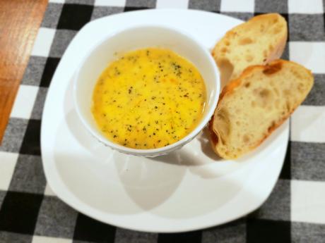 A fourth participant's finished soup, plated along with some bread.