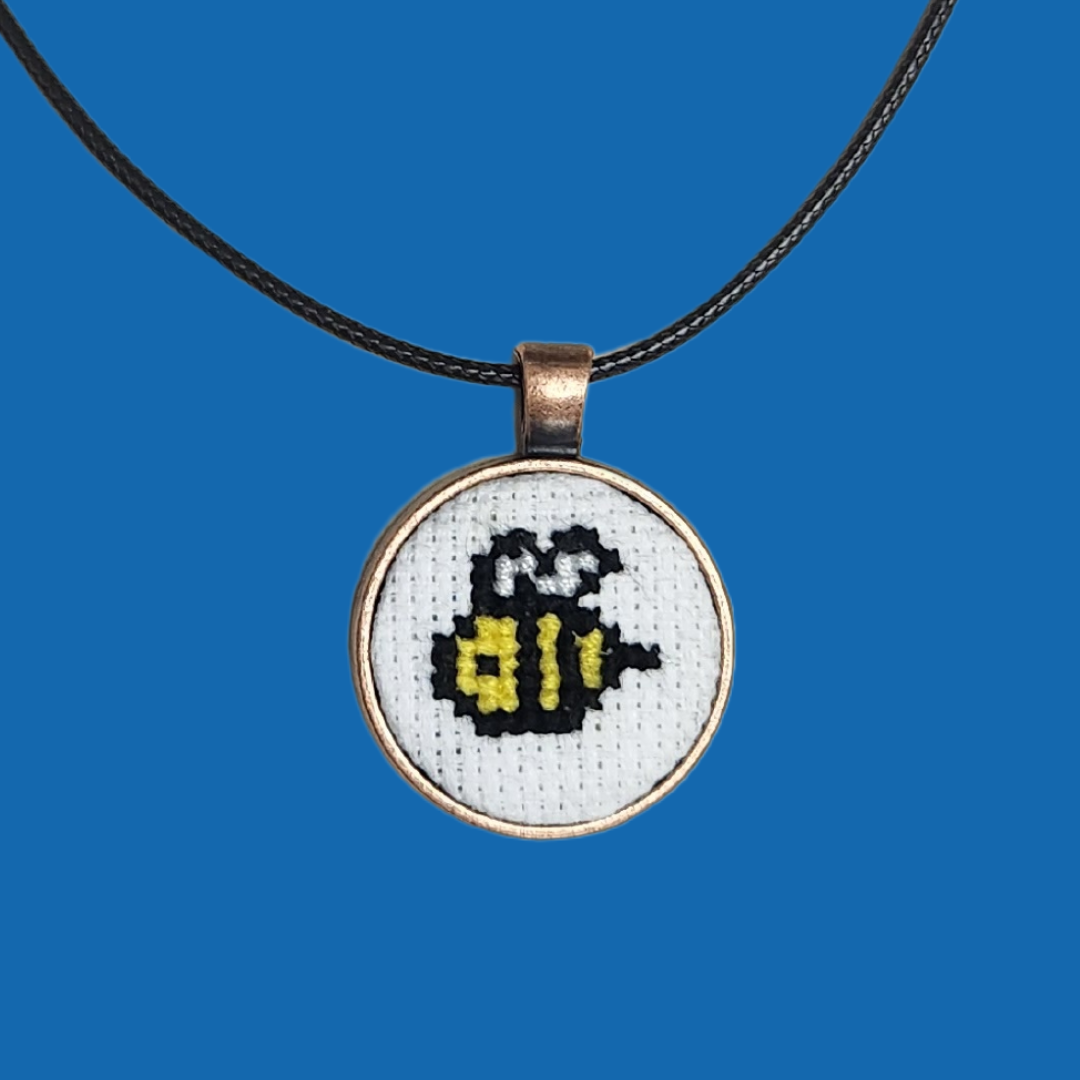 An example of the craft- a small cross stitch bee is on a necklace pendant.