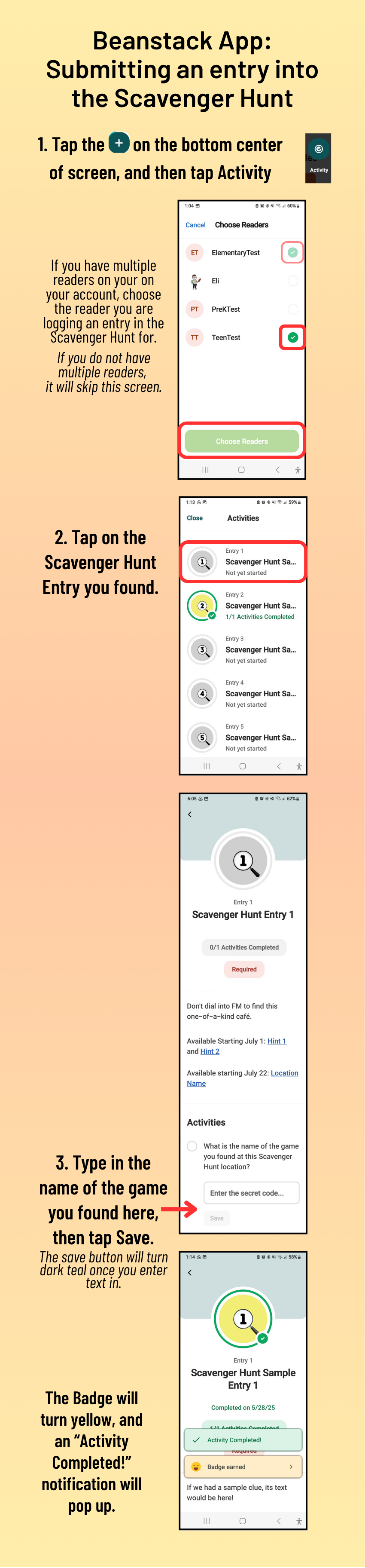 Each Scavenger Hunt clue will lead you to a location; once at that location, find the game and enter it into the corresponding Activity Badge in the Scavenger Hunt Challenge on Beanstack.