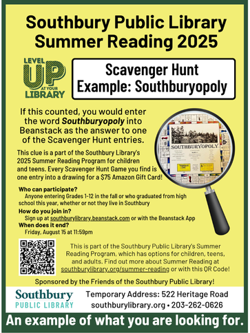 Sponsored by the Friends of the Southbury Public Library. We are also grateful to all the local organizations and businesses who partnered with us to serve as locations on our scavenger hunt.